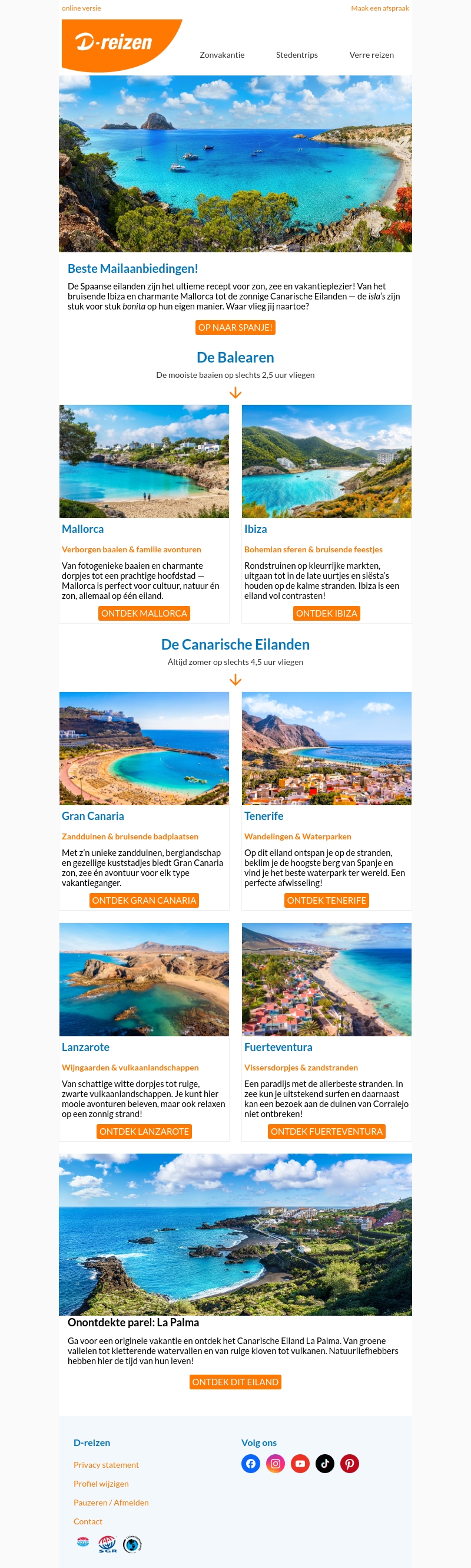 De Spaanse eilanden bieden de perfecte mix van zon, zee en vakantieplezier. Verken de prachtige baaien van Mallorca, dompel je onder in de bohemien sferen van Ibiza of geniet van de altijd aanwezige zomer op de Canarische Eilanden. Van avontuur in Gran Canaria tot het ontdekken van het vulkanische landschap op Lanzarote, er is voor elk wat wils. Waar vlieg jij naartoe?