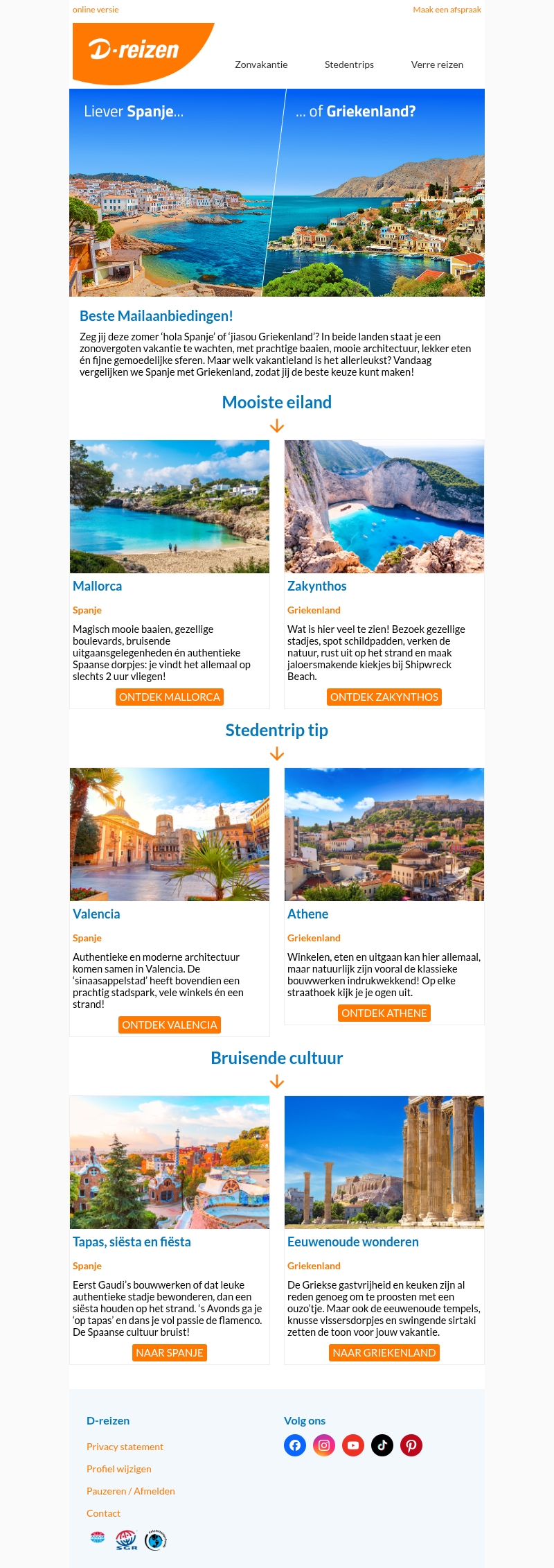 Ben jij op zoek naar een zonvakantie in Spanje of Griekenland? Beide bieden prachtige stranden, rijke cultuur en heerlijke gerechten. Ontdek de mooiste eilanden zoals Mallorca en Zakynthos, of ga voor een stedentrip naar Valencia of Athene. Laat je inspireren door bruisende cultuur en eeuwenoude wonderen. Kies jouw favoriet en geniet van een onvergetelijke vakantie.