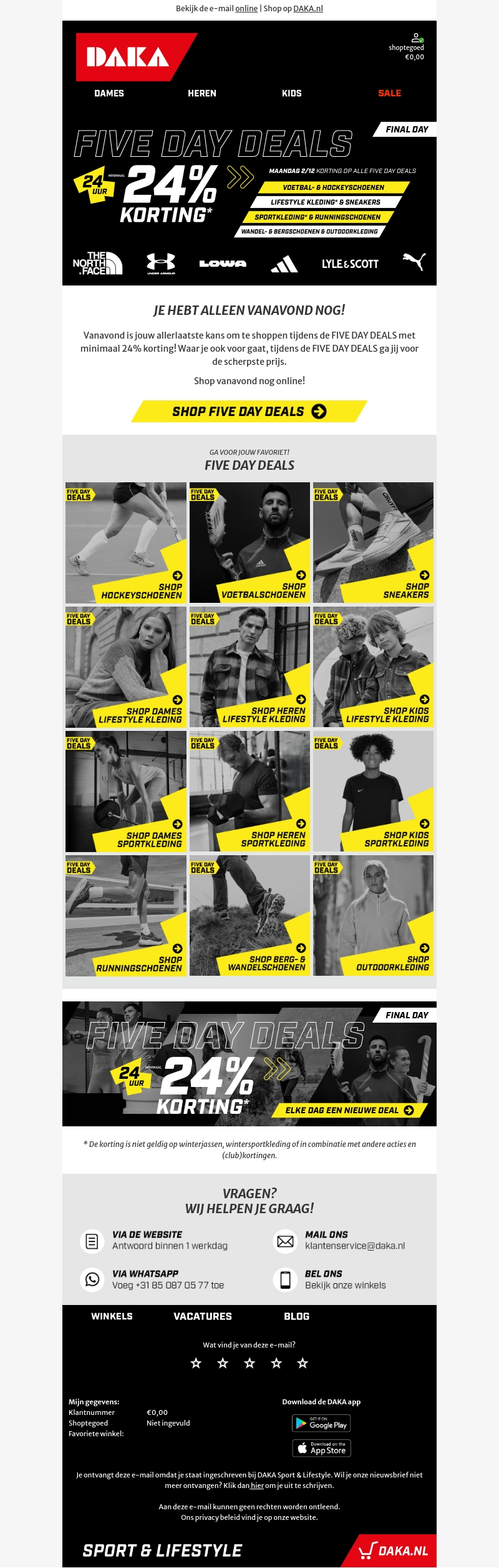 Alleen vandaag heb je de kans om te profiteren van minimaal 24% korting op de FIVE DAY DEALS bij DAKA. Van voetbalschoenen tot lifestyle kleding, bemachtig je favoriete items tegen de scherpste prijzen. Mis deze unieke kans niet en shop snel online!