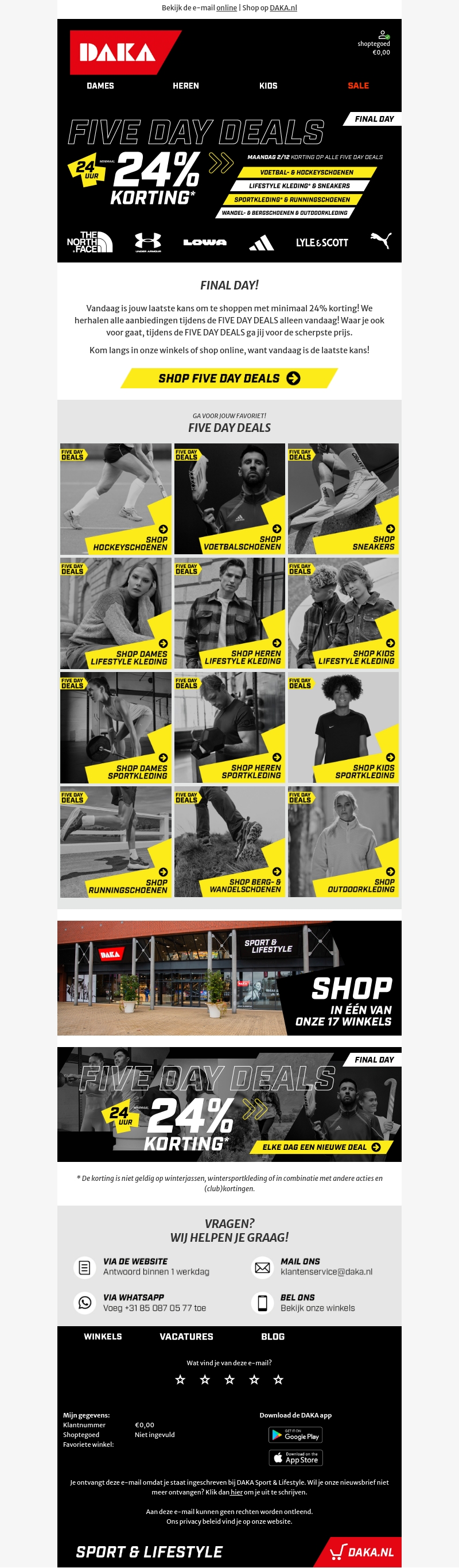 Mis je kans niet bij DAKA's Five Day Deals! Geniet van minimaal 24% korting op een breed scala aan producten, van voetbalschoenen tot outdoor kleding. Bezoek onze winkels of shop online om te profiteren van deze scherpe aanbiedingen. Vandaag is de laatste kans om je favoriete artikelen met korting te bemachtigen. Ga snel naar DAKA en scoor je deals!