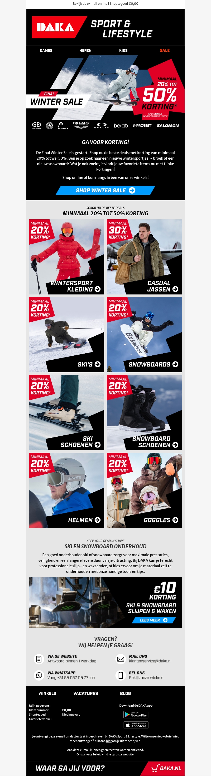De Final Winter Sale is van start! Ontdek kortingen van minimaal 20% tot 50% op onze uitgebreide wintersport collectie. Of je nu op zoek bent naar nieuwe skischoenen, casual jassen, of een snowboard, DAKA biedt alles wat je nodig hebt voor je winteravontuur. Haast je naar onze winkels of shop online om jouw favoriete items te bemachtigen. Mis deze kans niet op geweldige kortingen en profiteer van de beste deals.