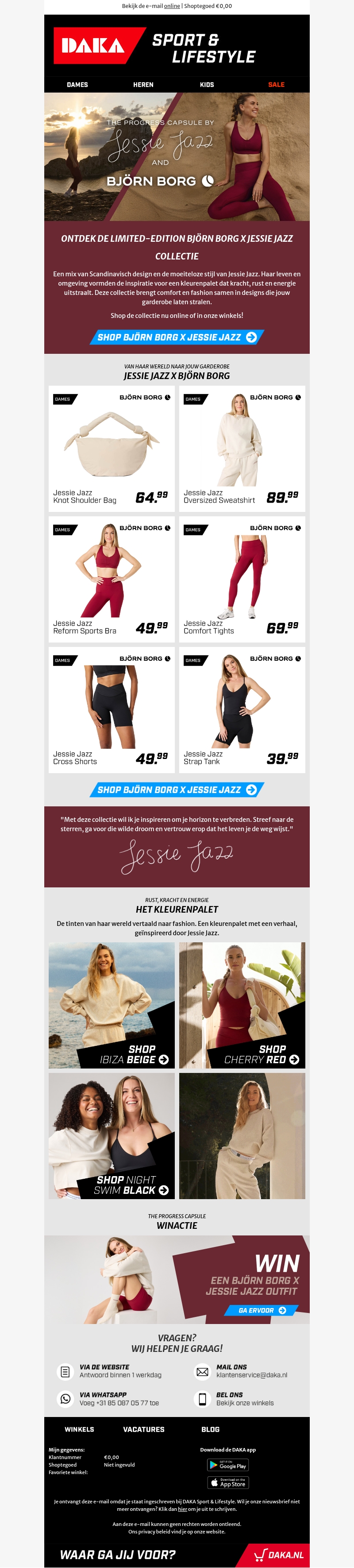 Ervaar de nieuwe limited-edition collectie van Björn Borg en Jessie Jazz bij DAKA. Deze samenwerking biedt een mix van Scandinavisch design met de flair van Jessie Jazz. Met unieke kleuren en stijlen brengt deze collectie kracht en rust naar je garderobe. Ontdek de inspirerende selectie van sportkleding en accessoires die jouw stijl naar een hoger niveau tillen. Bovendien maak je kans om een outfit uit The Progress Capsule te winnen, perfect voor de modebewuste sporter.