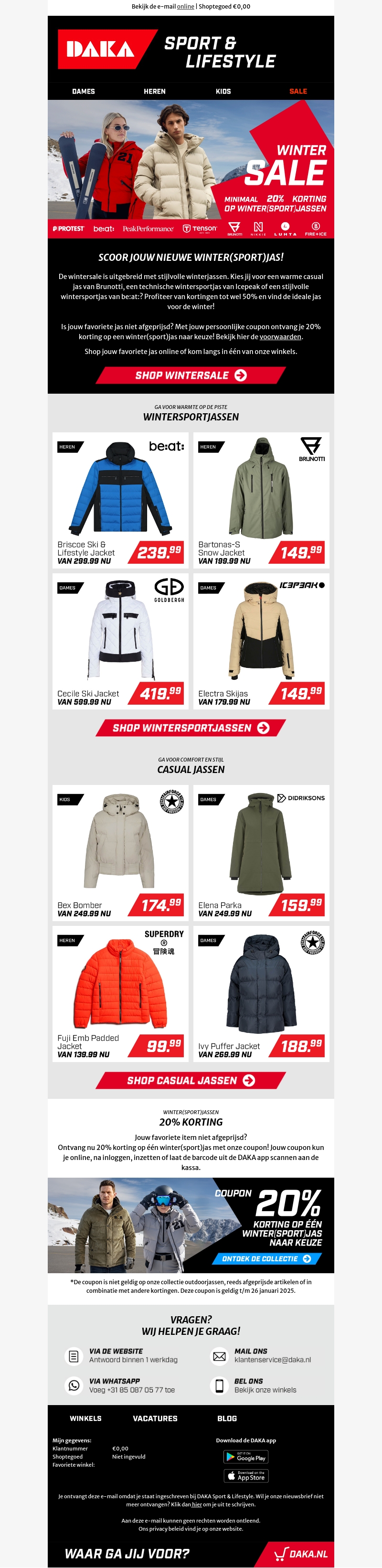De winter is aangebroken en dat betekent grote kortingen op onze wintercollectie! Kies uit stijlvolle en warme jassen met tot wel 50% korting. Mis de kans niet om jouw ideale winterjas te scoren. Profiteer nu van de aanbiedingen voordat het te laat is.