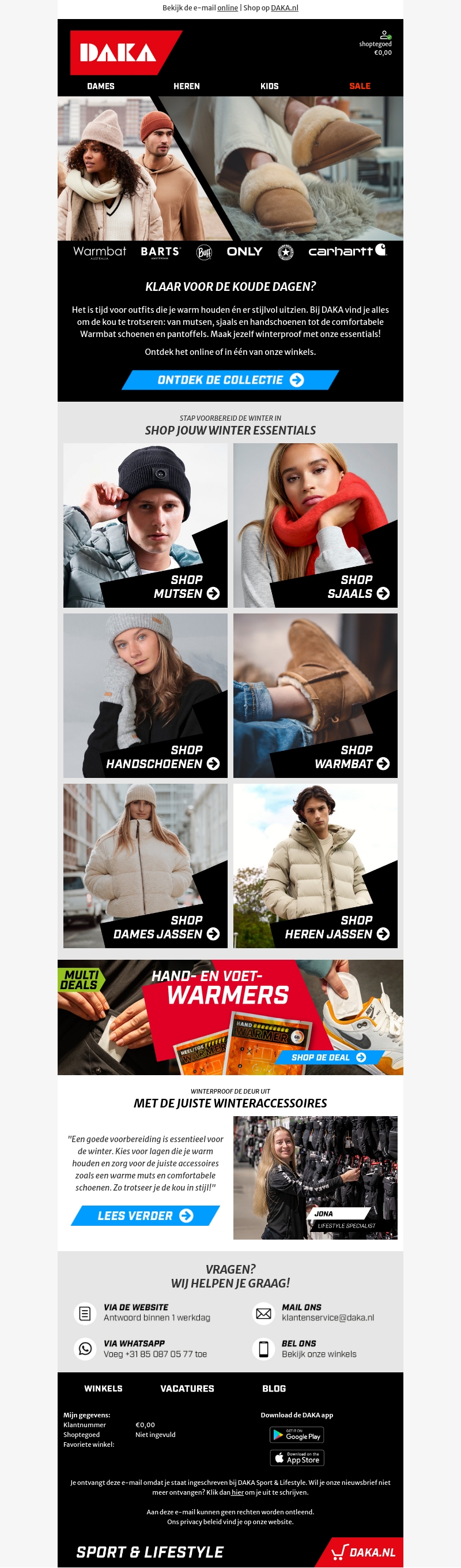 Bereid je voor op de koude dagen met DAKA's winter must-haves. Van warme mutsen en sjaals tot comfortabele schoenen en pantoffels. Ook zijn er hand- en voetwarmers beschikbaar om je extra warm te houden. Ontdek de essentials in onze collectie en blijf stijlvol deze winter. Shop jouw favoriete winterkleding eenvoudig online!