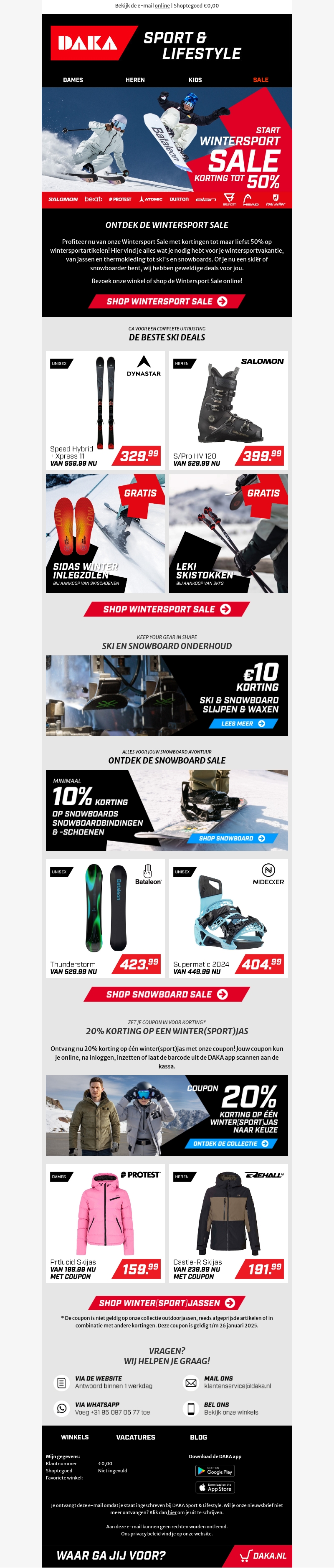 Profiteer van geweldige kortingen tot 50% tijdens de Daka Wintersport Sale. Van ski's en snowboards tot winterjassen, alles wat je nodig hebt voor een fantastisch wintersportseizoen. Bekijk de nieuwste aanbiedingen en maak je klaar voor avontuur in de sneeuw. Mis de gratis items en extra kortingen niet!