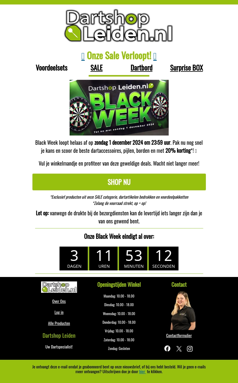 Black Week bij DartshopLeiden.nl eindigt op zondag 1 december 2024 om 23:59 uur. Ontvang tot 20% korting op dartaccessoires, pijlen en borden. Beperkte voorraad, dus wacht niet te lang met bestellen. Profiteer nu van de beste deals en vul je winkelmandje. Let op: vanwege drukte kan de levering iets langer duren.
