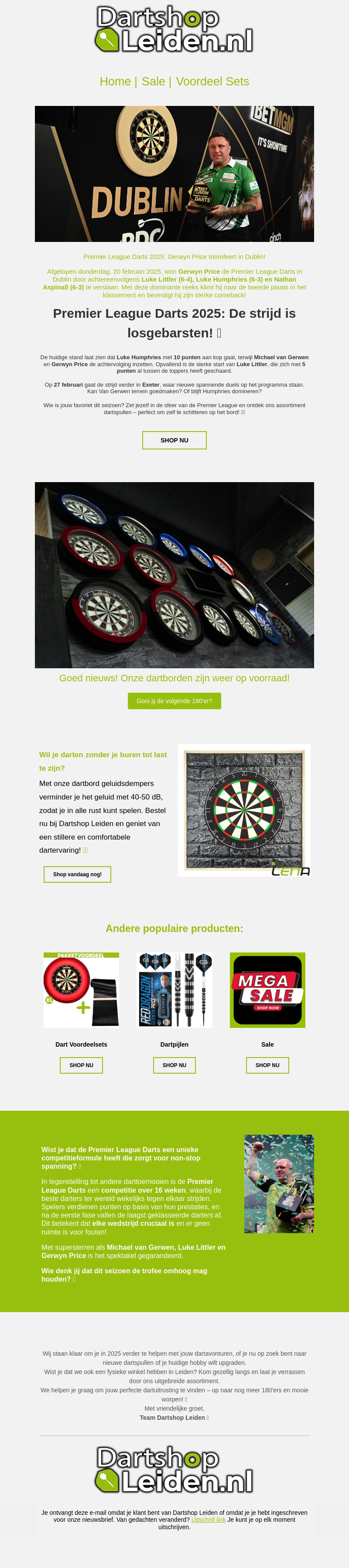 Goed nieuws voor dartliefhebbers! Jouw favoriete dartspullen zijn weer beschikbaar. Bereid je voor op de Premier League Darts 2025 met onze uitgebreide collectie. Ontdek voordeelsets, stille dartborden en meer. Mis de actie niet en shop vandaag nog!