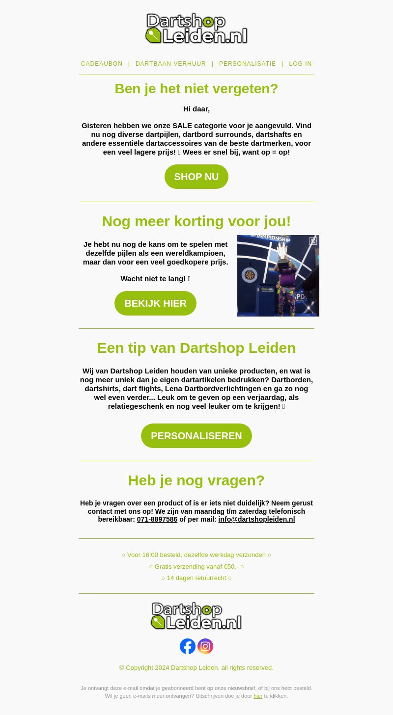 Hallo daar, wij hebben onze SALE categorie aangevuld met diverse dartpijlen, dartbord surrounds, dartshafts en meer. Profiteer nu van fantastische kortingen op je favoriete dartbenodigdheden. Bezoek onze webshop voor de beste deals. Wacht niet te lang, op = op!