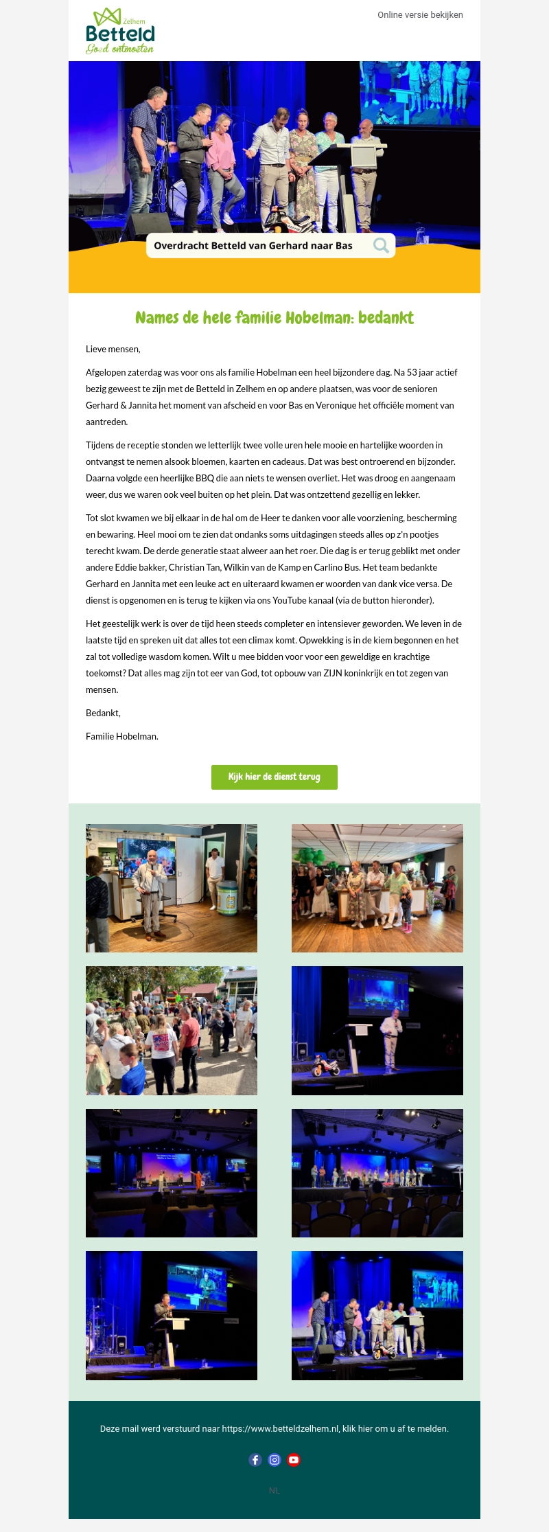 Familie Hobelman bedankt iedereen voor de steun tijdens hun speciale dag. Er waren ontroerende toespraken, een heerlijke BBQ en een emotioneel afscheid van Gerhard en Jannita. Beleef de dienst opnieuw via ons YouTube-kanaal.