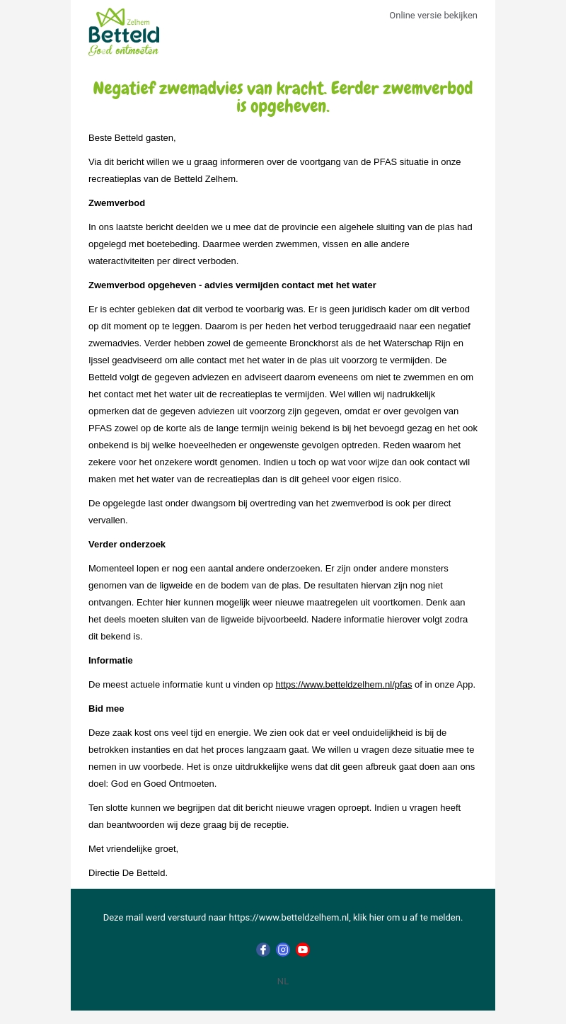 Beste Betteld gasten, in deze nieuwsbrief informeren we jullie over de voortgang van de PFAS situatie in onze recreatieplas. Het eerder geldende zwemverbod is opgeheven, maar er blijft een negatief zwemadvies van kracht. We adviseren om contact met het water te vermijden.