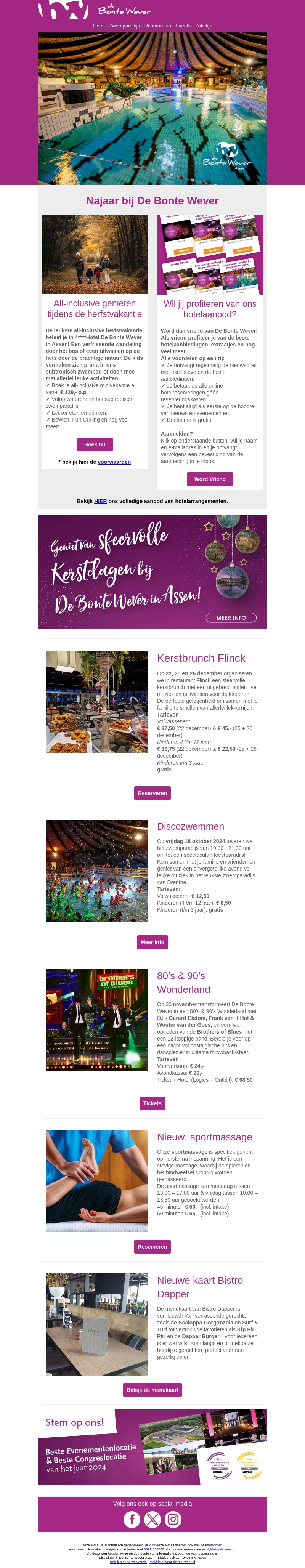 Ontdek de all-inclusive herfstvakantie bij De Bonte Wever met tal van activiteiten. Profiteer van speciale hotelaanbiedingen en geniet van discomomenten en thema-avonden. Verwen uzelf met een sportmassage of culinaire verwennerij in Bistro Dapper.