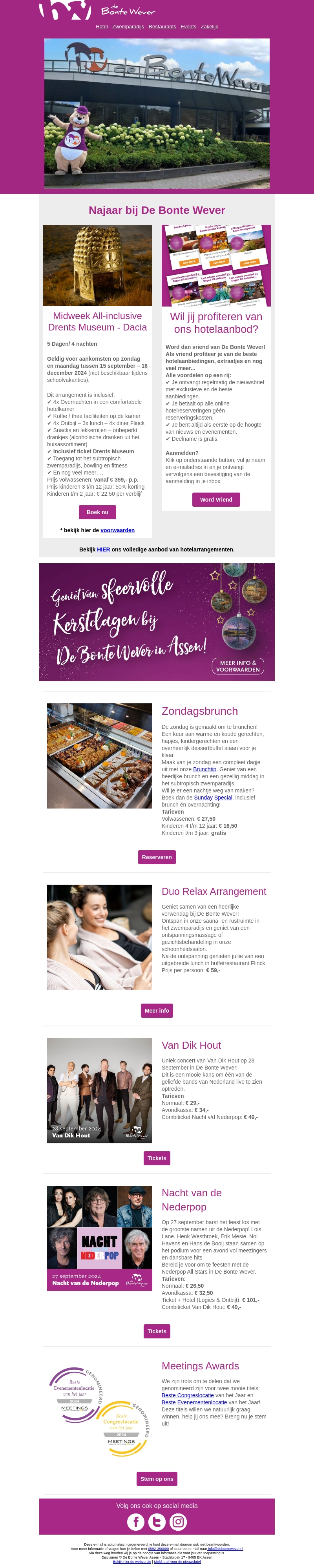 Bij De Bonte Wever staat het najaar in het teken van exclusieve aanbiedingen. Geniet van onze Midweek All-inclusive deal, boek een ontspannen Duo Relax Arrangement of beleef live muziek met Van Dik Hout. Reserveer nu voor onvergetelijke momenten!