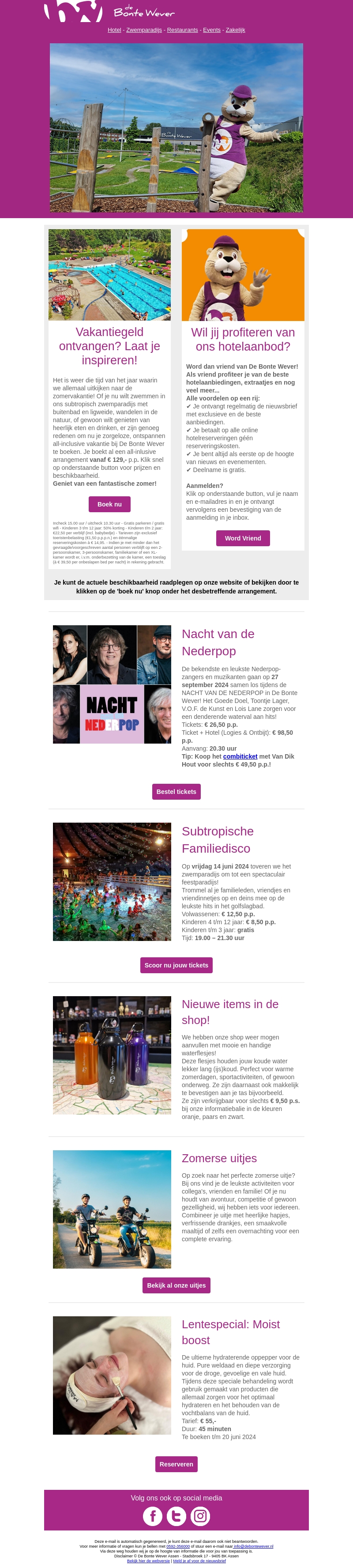 Deze zomer presenteert De Bonte Wever aantrekkelijke vakantieaanbiedingen. Beleef een fantastisch zomerseizoen met hoteldeals, subtropische familiedisco, nacht van de Nederpop, en nog veel meer. Ontdek nieuwe items in de shop, neem deel aan zomerse uitjes en verwen jezelf met de Lentespecial: Moist boost!