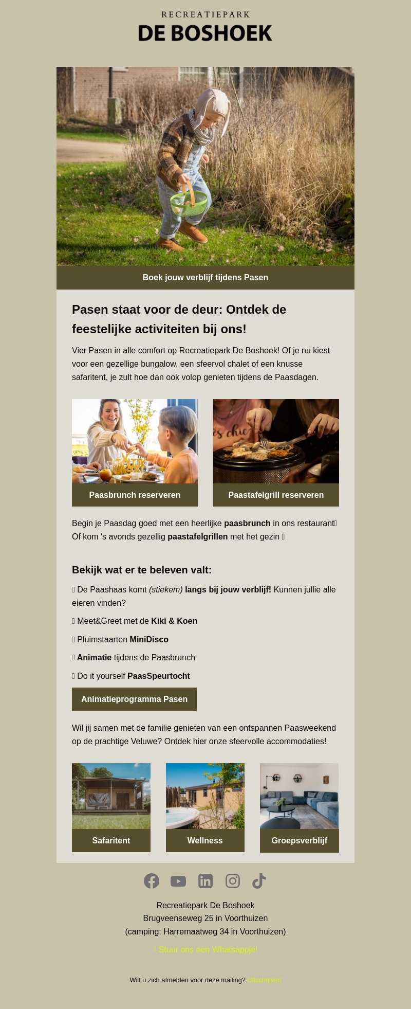 Beleef een onvergetelijke Pasen bij Recreatiepark De Boshoek. Geniet van een luxe verblijf in een bungalow, chalet of safaritent. Begin de dag met een smakelijke paasbrunch en sluit af met een gezellige paastafelgrill. Voor de kinderen zijn er tal van activiteiten zoals een paasanimatieprogramma. Ontdek de pracht van de Veluwe tijdens de paasdagen.