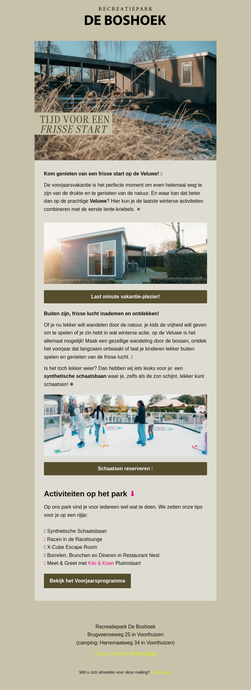 Ontdek de Veluwe dit voorjaar en geniet van diverse buitenactiviteiten op Recreatiepark De Boshoek. Ga wandelen of ontdek de natuur met de kinderen. Beleef plezier op de synthetische schaatsbaan en geniet van het voorjaar. Bekijk ons voorjaarsprogramma en laat je inspireren door onze tips.