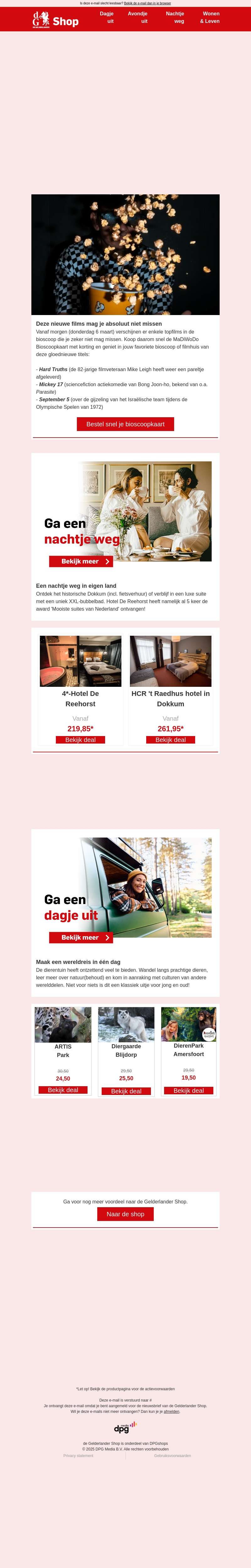 Mis geen enkele filmhit deze maand met onze topselectie. Ontdek spannende trailers en plan je bioscoopbezoek met korting. Geniet ook van een heerlijk nachtje weg of een dagje uit met onze aanraders. Bekijk de beste hotels en pretparken om je vrije tijd optimaal te benutten. Profiteer van tijdelijke aanbiedingen om te relaxen en te ontspannen. Maak er een onvergetelijke tijd van!