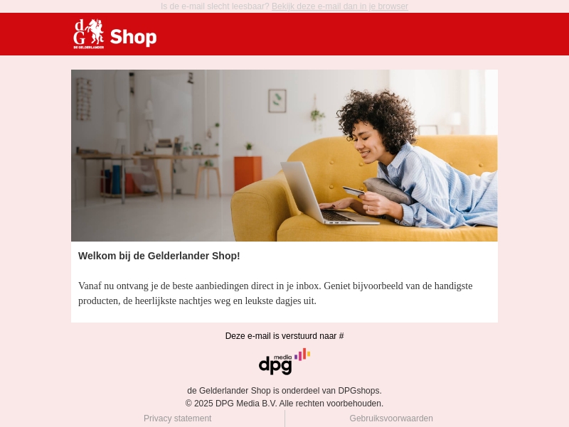 Welkom bij de Gelderlander Shop! Hier vind je exclusieve aanbiedingen rechtstreeks in je inbox. Geniet van handige producten, heerlijke nachtjes weg en de leukste dagjes uit. Mis geen enkele deal en ontdek wat er allemaal te bieden is.