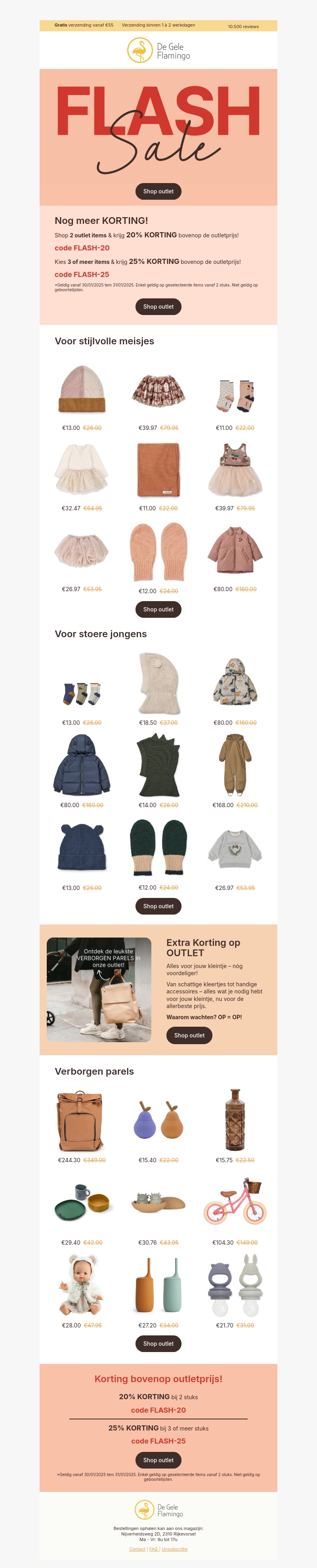 Doe mee met onze flash sale en ontvang tot wel 25% extra korting op outlet items bij De Gele Flamingo. Ontdek prachtige kinderkleding voor stijlvolle meisjes en stoere jongens. Profiteer van geweldige aanbiedingen op kleding en accessoires. Shop snel, want op is op! Gebruik de kortingscode voor extra voordeel.