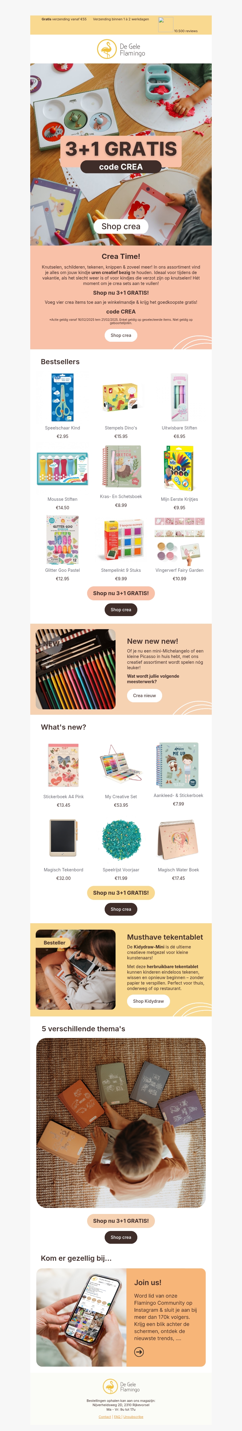 Ontdek nu de geweldige 3+1 gratis actie op creatief speelgoed. Verwen de kleintjes met leuke knutselsets en creatieve materialen. Of je nu wilt tekenen, schilderen of knutselen, er is voor ieder wat wils. Grijp deze kans om je voorraad aan te vullen. Shop de bestsellers en nieuwe items vandaag nog!