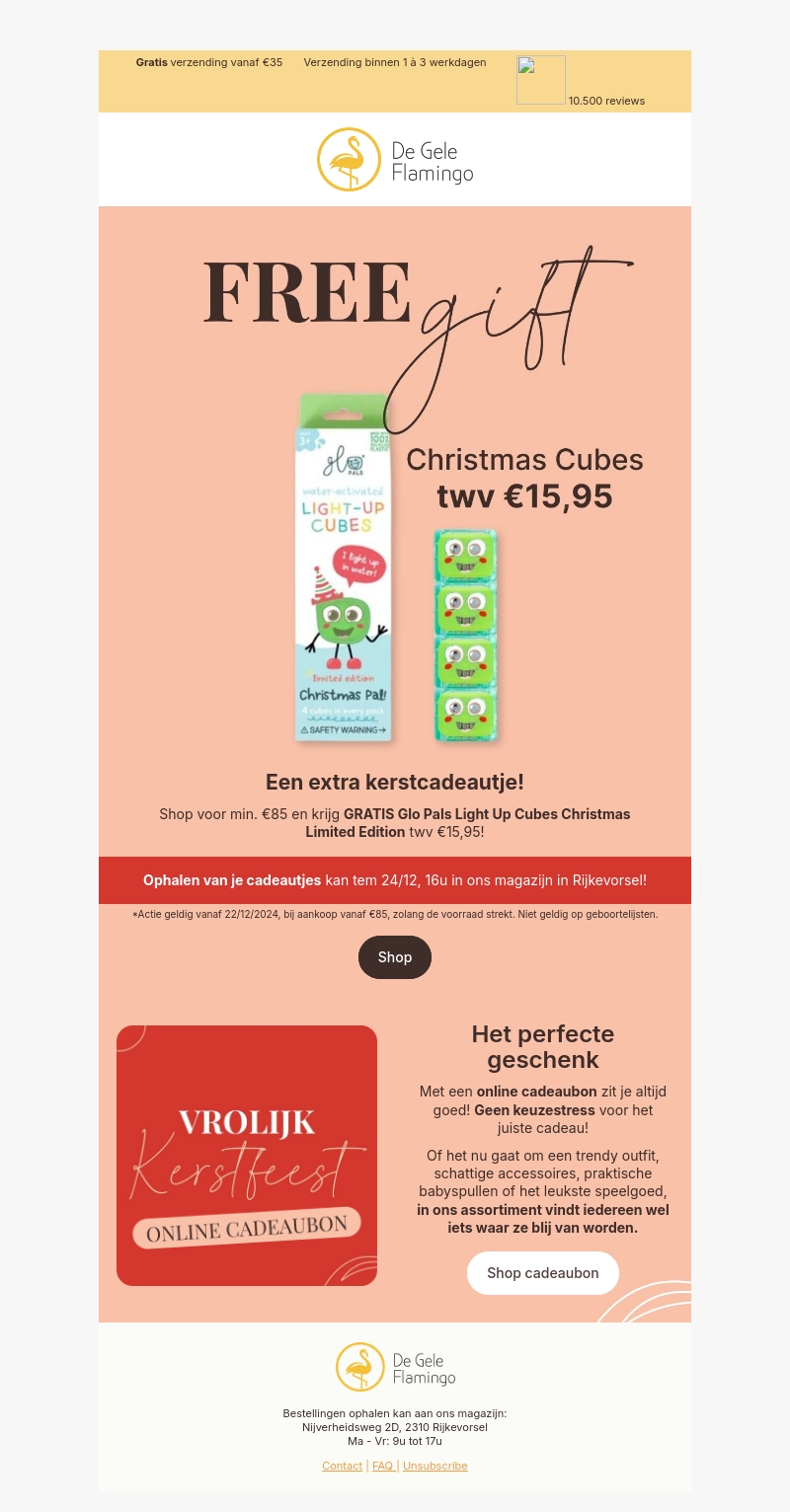 Ontvang een GRATIS Glo Pals Light Up Cubes Christmas Limited Edition ter waarde van €15,95 bij een minimale besteding van €85 bij De Gele Flamingo. Perfect voor de feestdagen met een ruime keuze aan cadeaus. Haal je bestelling op tot 24/12 in Rijkevorsel.