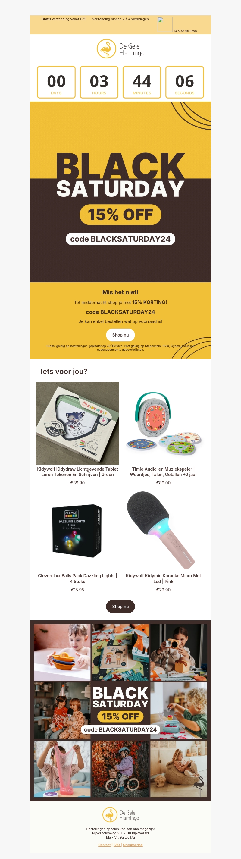 Profiteer van 15% korting bij de Black Saturday Sale van De Gele Flamingo. Gebruik kortingscode BLACKSATURDAY24 voor middernacht. Geldig op bestellingen geplaatst op 30/11/2024. De actie geldt alleen op de beschikbare voorraad en is niet geldig op bepaalde producten.