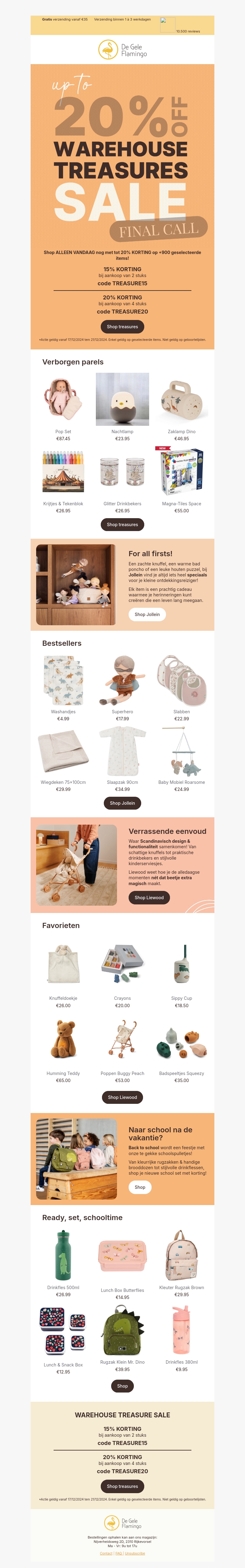 Mis deze laatste kans niet om geweldige schatten te ontdekken in onze magazijnuitverkoop. Geniet van kortingen tot 20% op geselecteerde items, waaronder kinderkleding, accessoires en meer. Dit aanbod is alleen vandaag geldig. Grijp nu je kans en gebruik de speciale kortingscodes bij het afrekenen.