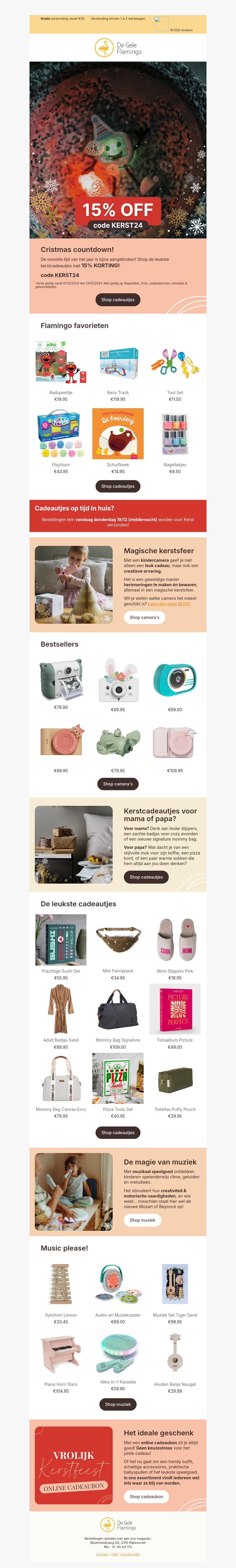 Mis de laatste kans niet om te genieten van 15% korting op onze speciale kerstaanbiedingen. Blader door onze selectie van favoriete cadeaus, van speelgoed voor kinderen tot prachtige geschenken voor volwassenen. Bestel nu en ontvang alles op tijd voor de feestdagen. Gebruik de code KERST24 bij het afrekenen. Shop nu en maak de kerst nog specialer!