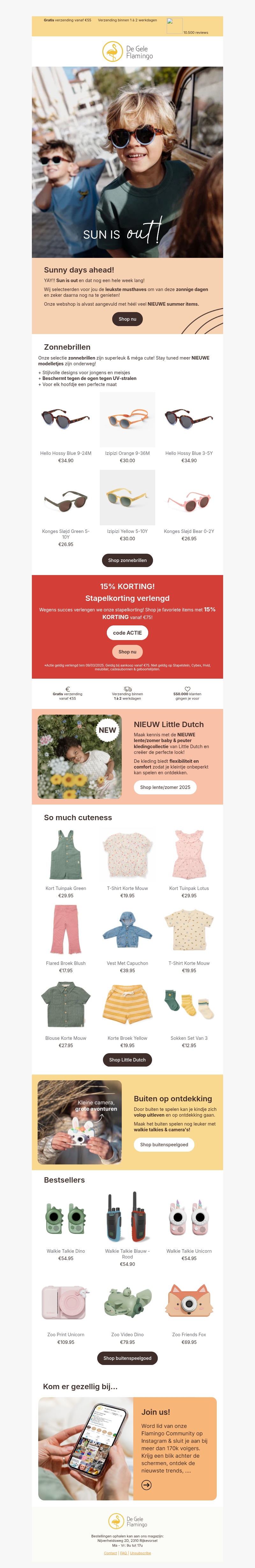 De zon is weer tevoorschijn, wat betekent dat het tijd is voor nieuwe garderobe musthaves! Ontdek de nieuwste collectie zonnebrillen en zomerkleding bij De Gele Flamingo. Profiteer van stapelkorting en geniet van trendy items zoals kinderjurken en accessoires. Kijk verder voor meer keuzes en begin het zonnige seizoen in stijl.