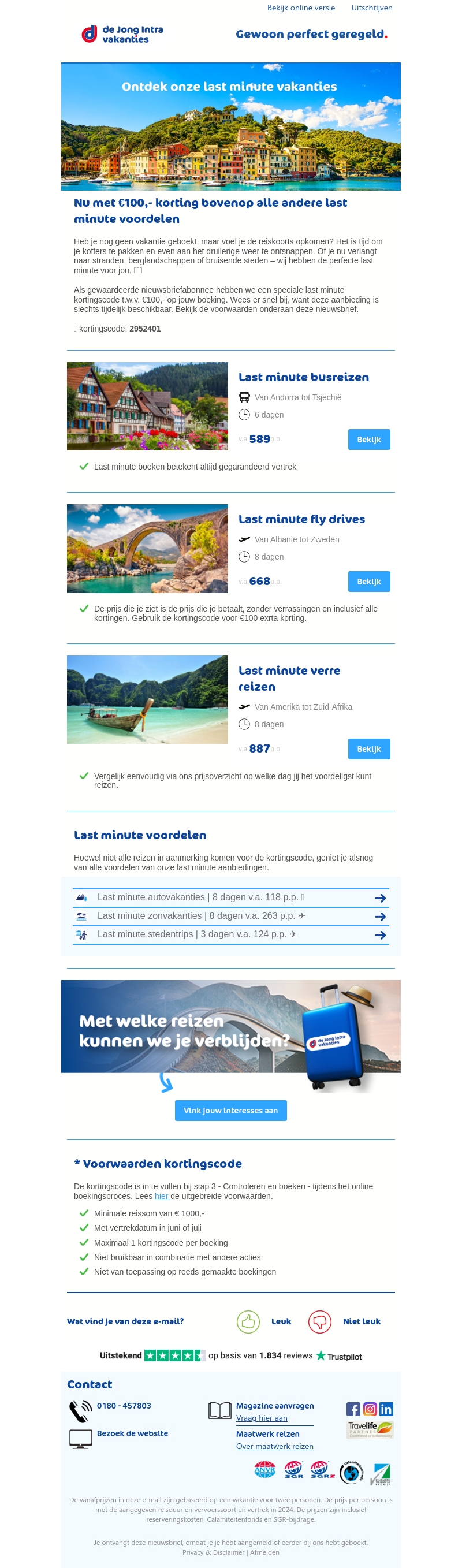 Heb je nog geen vakantie geboekt en voel je de reiskoorts opkomen? Ontdek onze last minute vakanties met €100 korting. Kies uit busreizen, fly drives en verre reizen, en geniet van gegarandeerd vertrek en all-in prijzen.