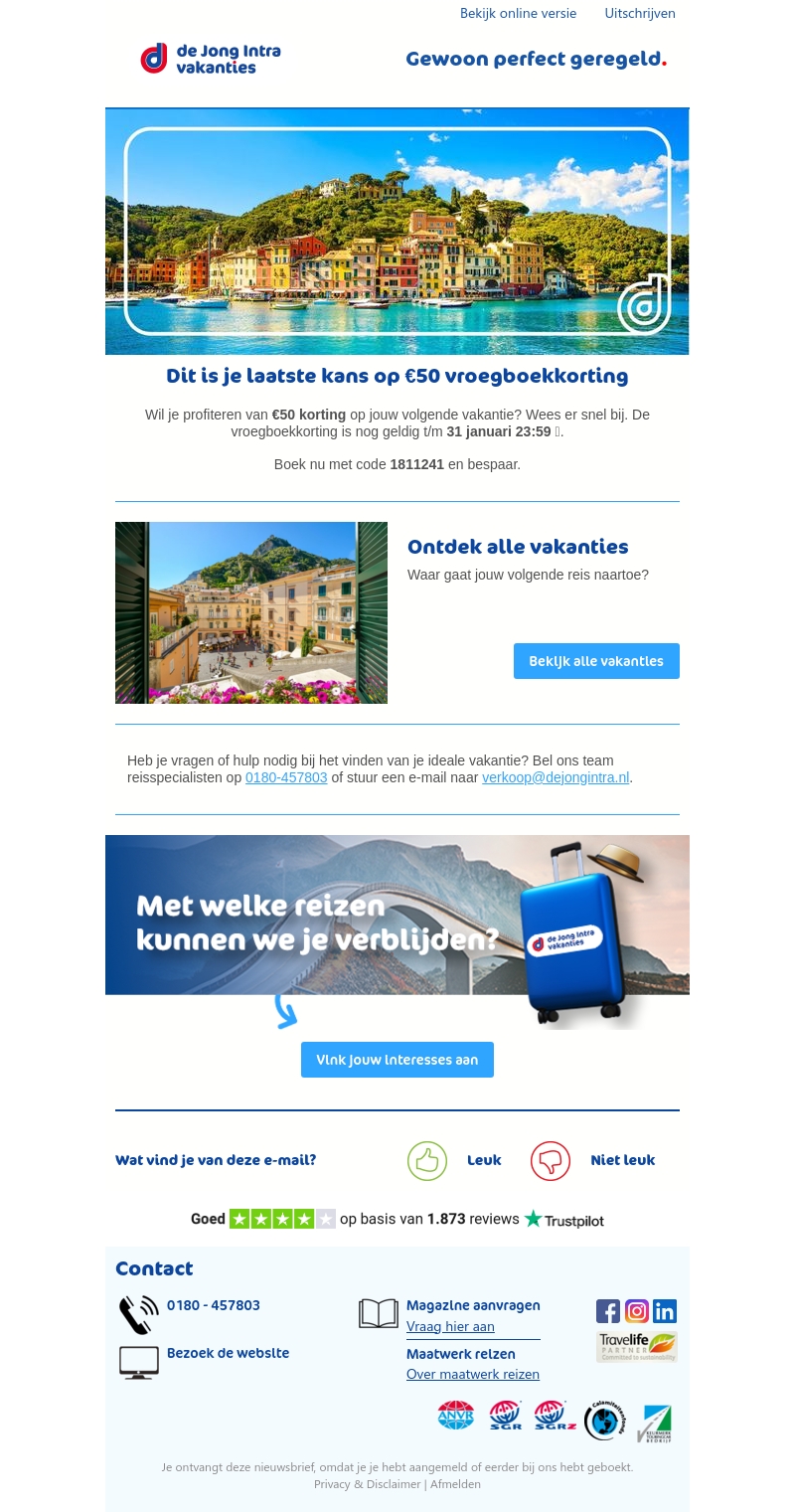 Mis je kans niet om €50 korting te ontvangen op je volgende reis. De kortingen zijn geldig tot 31 januari om 23:59, dus wees er snel bij. Ontdek de prachtige reisbestemmingen bij de Jong Intra Vakanties en plan je droomvakantie. Heb je vragen of hulp nodig? Neem contact op met onze reisspecialisten. Boek nu en geniet van een zorgeloze vakantie.