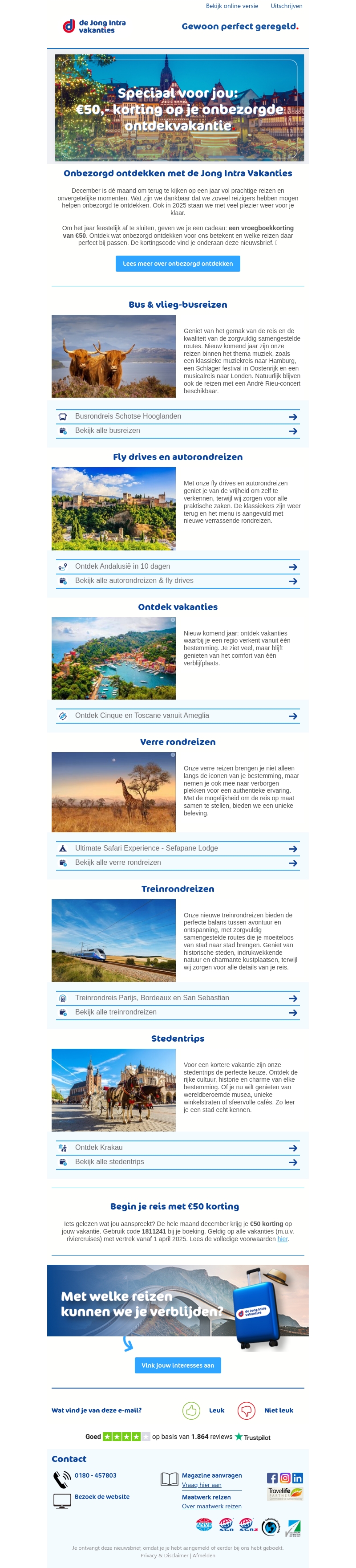 De Jong Intra Vakanties biedt een speciale actie met β¬50 korting op diverse reizen. Verken nieuwe bestemmingen met bus-, trein-, of autorondreizen en geniet van een zorgeloze ervaring. Ontdek schitterende plekken zoals AndalusiΓ« en Cinque Terre. Begin je reisavontuur met deze geweldige aanbieding.
