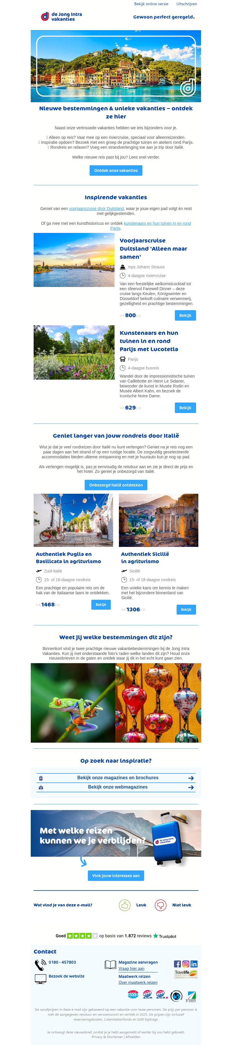 In deze nieuwsbrief ontdek je spannende nieuwe bestemmingen en unieke vakanties. Of je nu alleen reist of met vrienden, er zijn geweldige opties voor iedereen. Ontdek de schoonheid van Duitsland, ItaliΓ« en meer. Bekijk aanbiedingen voor lentecruises en culturele trips in en rond Parijs. Geniet langer van je reis door ItaliΓ« met onze rondreizen.