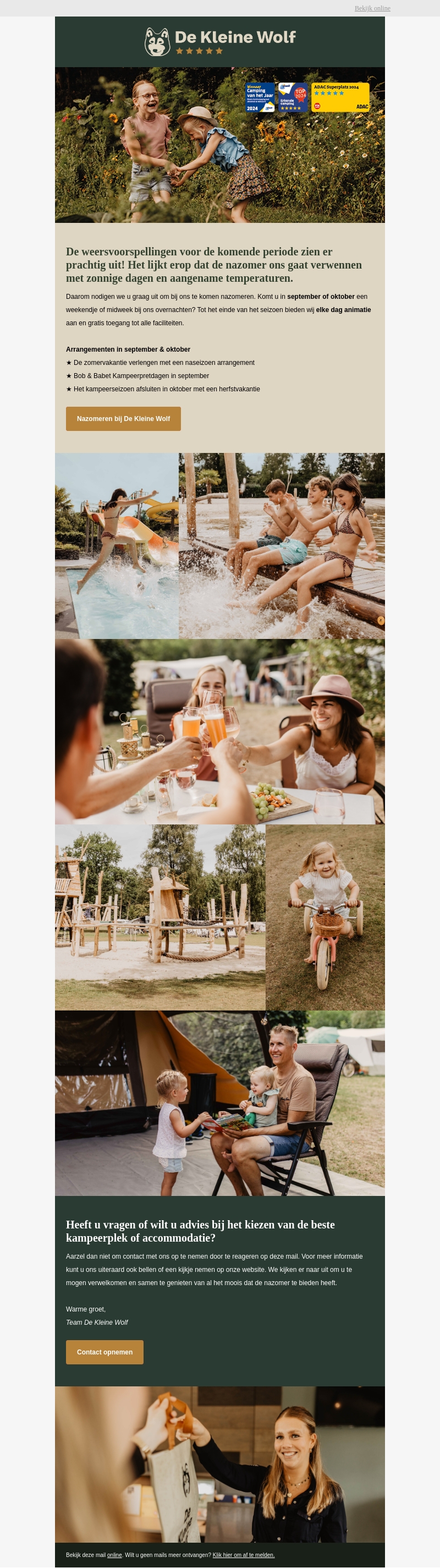 De weersvoorspellingen voor de komende periode zien er fantastisch uit! De nazomer belooft ons te verwennen met zonnige dagen en aangename temperaturen. Daarom nodigen we u graag uit om bij ons te komen nazomeren. Wij bieden elke dag animatie aan en gratis toegang tot alle faciliteiten. Boek nu uw weekendje of midweek bij De Kleine Wolf en geniet van onze arrangementen.
