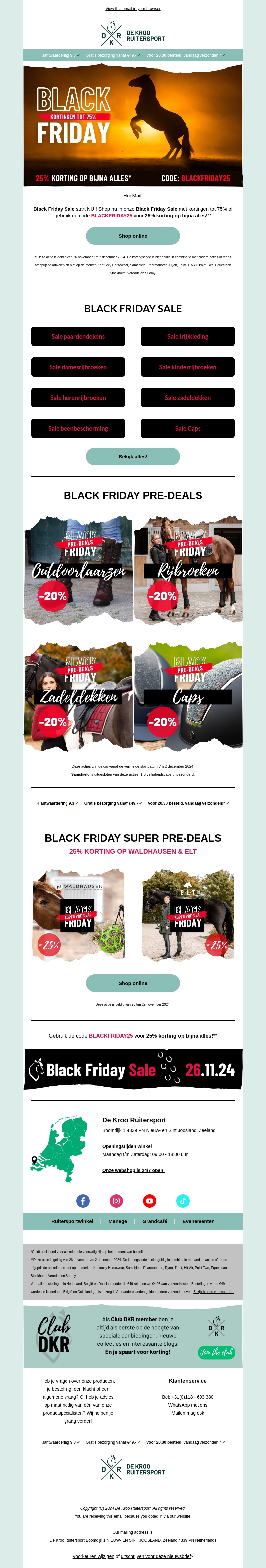 De Kroo Ruitersport presenteert de ultieme Black Friday Sale met kortingen tot 75% op bijna alles. Ontdek de nieuwste deals op paardendekens, rijlaarzen, en meer. Gebruik de code BLACKFRIDAY25 voor extra voordeel op geselecteerde items.