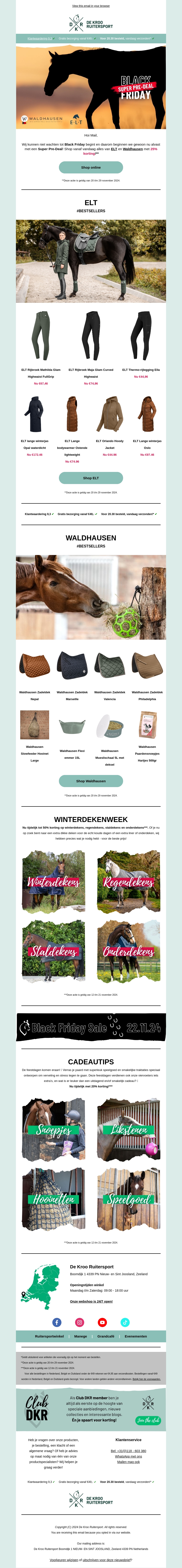 Deze nieuwsbrief zit boordevol verrassende vroegtijdige Black Friday deals van De Kroo Ruitersport. Vind de beste aanbiedingen voor paardensportkleding, accessoires en cadeau-ideeΓ«n. Profiteer van deze unieke pre-deals en begin je feestelijke shopping nu! Bekijk onze collecties van merken zoals ELT en Waldhausen. Ervaar de spanning van uitverkoop nog voor de grote dag.