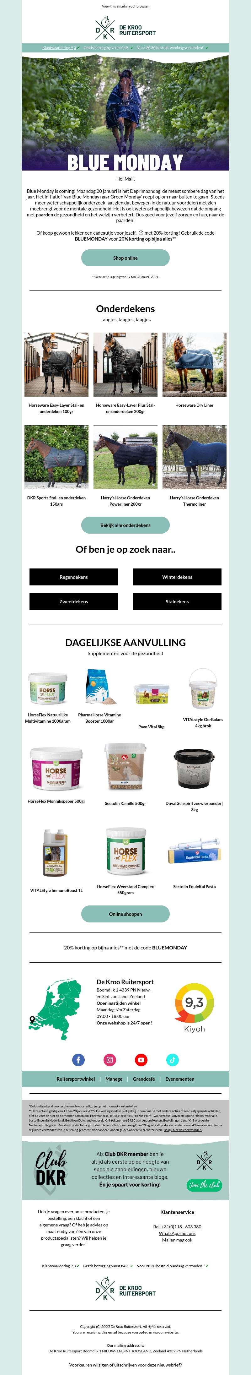Blue Monday nadert en wij helpen je door deze dag te komen met geweldige aanbiedingen en tips. Profiteer van onze speciale korting op diverse producten en ontdek onze selectie van onderdekens en supplementen voor je paard. Gebruik de code BLUEMONDAY voor 20% korting op bijna alles! Ontzorg je paard en je portemonnee met onze exclusieve deals.