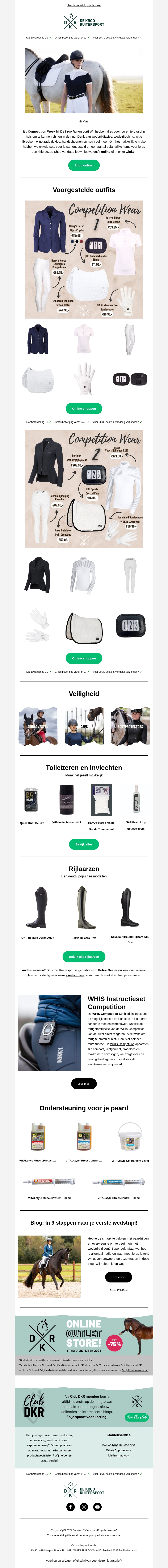 Bereid je voor op je volgende wedstrijd met de nieuwste wedstrijdkleding van topkwaliteit. Bekijk onze voorgestelde outfits, veiligheid uitrusting, rijlaarzen, en verzorgingsproducten voor je paard. Mis ook de exclusieve aanbiedingen van onze online outlet store.