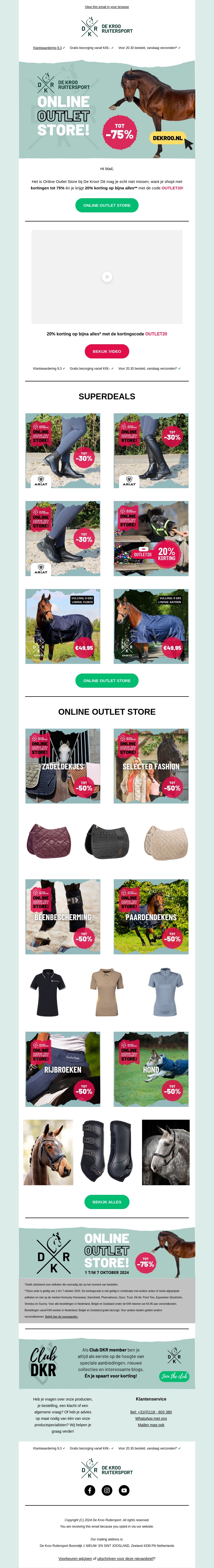Mis deze fantastische deals niet! Bezoek de Online Outlet Store van De Kroo Ruitersport voor kortingen tot wel 75% op diverse ruitersportartikelen. Van superdeals op rijlaarzen tot paarden dekens en beenbescherming, er is voor ieder wat wils. Blijf op de hoogte van de nieuwste acties en word lid van Club DKR voor exclusieve voordelen.