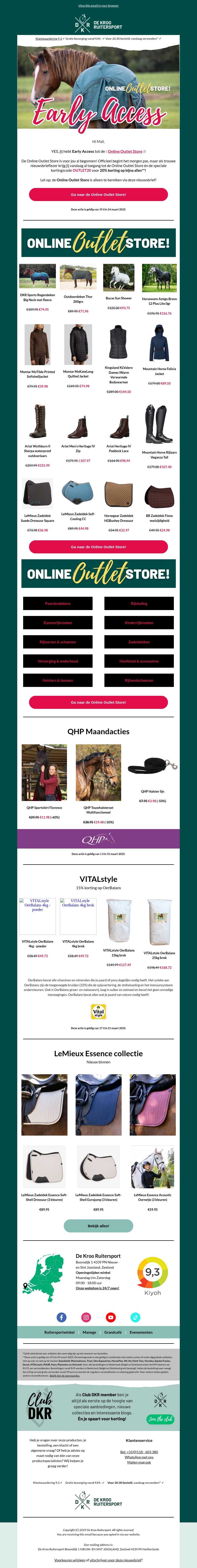 Ontvang nu vroege toegang tot de Online Outlet Store van De Kroo Ruitersport. Profiteer van geweldige kortingen op een breed assortiment ruitersportartikelen. Van laarzen tot dekens, er is voor ieder wat wils. Haast je om de beste deals te bemachtigen voordat ze weg zijn!