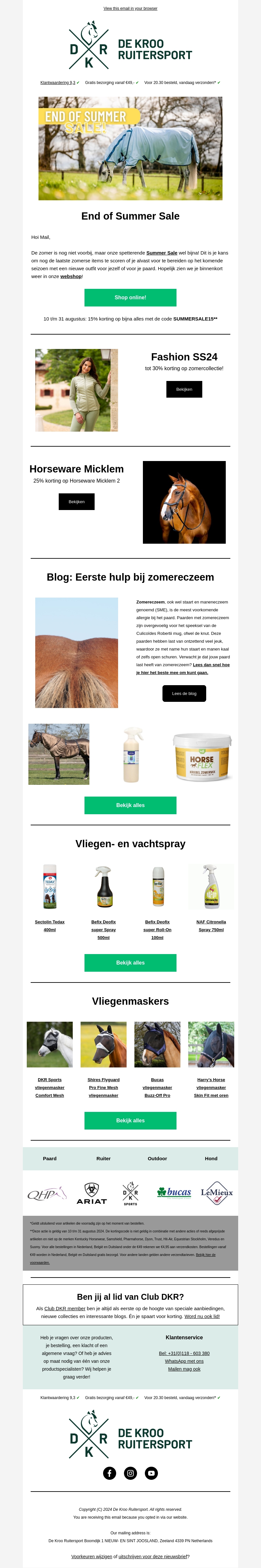 De zomer is nog niet voorbij, en daarom hebben wij een spectaculaire End of Summer Sale bij De Kroo Ruitersport! Geniet van 15% korting op bijna alles met de code SUMMERSALE15 tot 31 augustus. Ontdek daarnaast kortingen op de nieuwste zomercollectie, Horseware Micklem en diverse vliegspullen. Lees onze blog voor eerste hulp bij zomereczeem en bekijk ons assortiment vliegenspray en vliegenmaskers.