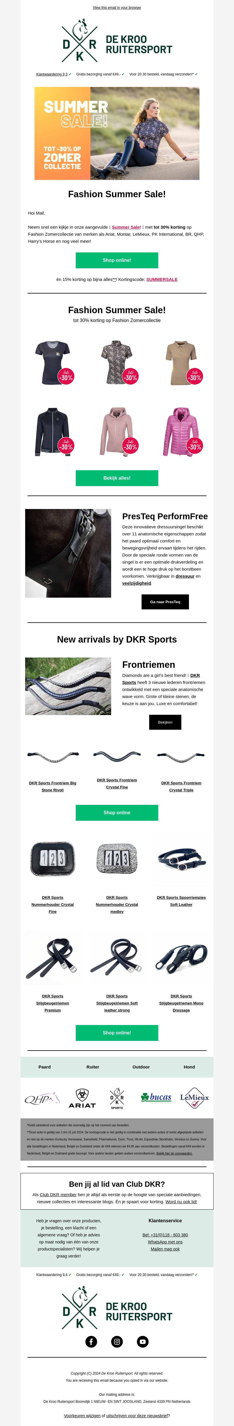 Bereid je voor op de zomer met de Fashion Summer Sale bij De Kroo Ruitersport! Ontvang tot wel 30% korting op topmerken zoals Anky, Montar en LeMieux op onze zomercollectie. Bovendien krijg je extra 15% korting op je bestelling met de code SUMMERSALE. Bekijk ook de nieuwste producten van DKR Sports waaronder frontriemen en stijgbeugels. Gegarandeerd kwaliteitsproducten!