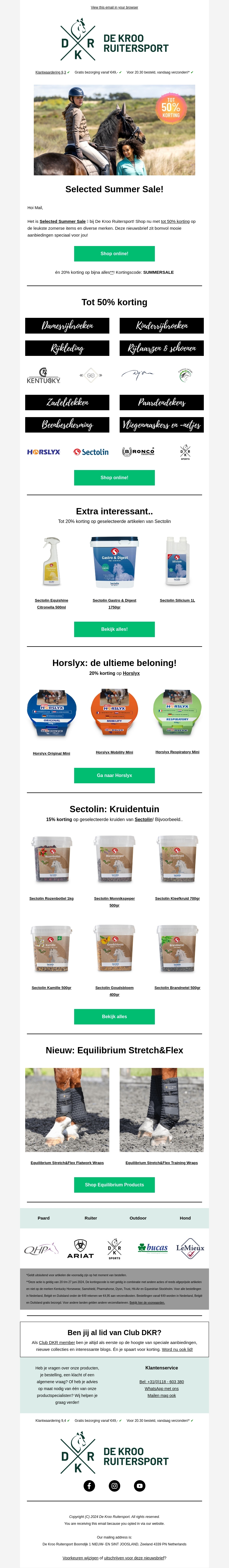 Hallo Ma.i, het is Selected Summer Sale bij De Kroo Ruitersport! Bespaar tot 50% op een breed scala aan paardensportartikelen van topmerken. Profiteer van extra kortingen op geselecteerde items en ontdek de nieuwe Equilibrium Stretch&Flex-collectie.