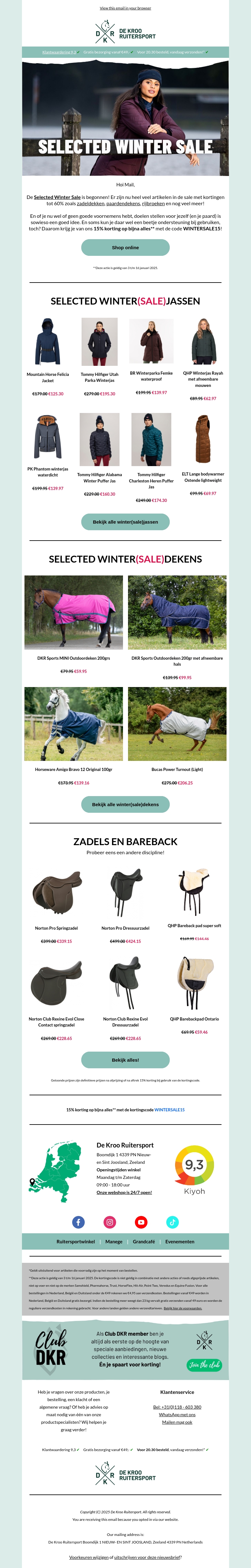Ontdek de ongekende aanbiedingen bij De Kroo Ruitersport met de Geselecteerde Winter Sale. Bespaar tot wel 60% op diverse producten, van stijlvolle winterjassen en comfortabele dekens tot hoogwaardige zadels. Mis deze kans niet om je favoriete artikelen tegen lage prijzen te scoren. Shop nu online en geniet van fantastische kortingen op topmerken. De actie is tijdelijk, dus wees er snel bij!