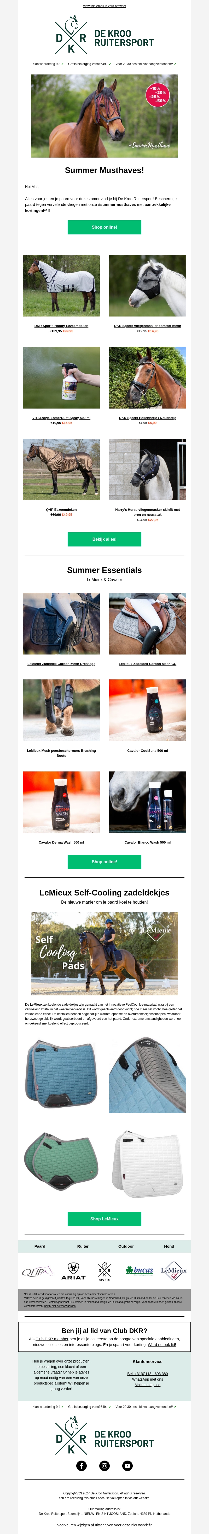 Alles wat je nodig hebt voor de zomer als ruiter vind je bij De Kroo Ruitersport. Profiteer van kortingen op topmerken zoals LeMieux, Cavalor, en meer. Van zelfkoelende zadeldekjes tot essentials zoals hoofddoeken en sprays, wij hebben het allemaal. Bezoek ons online en ontdek de beste aanbiedingen van dit seizoen.