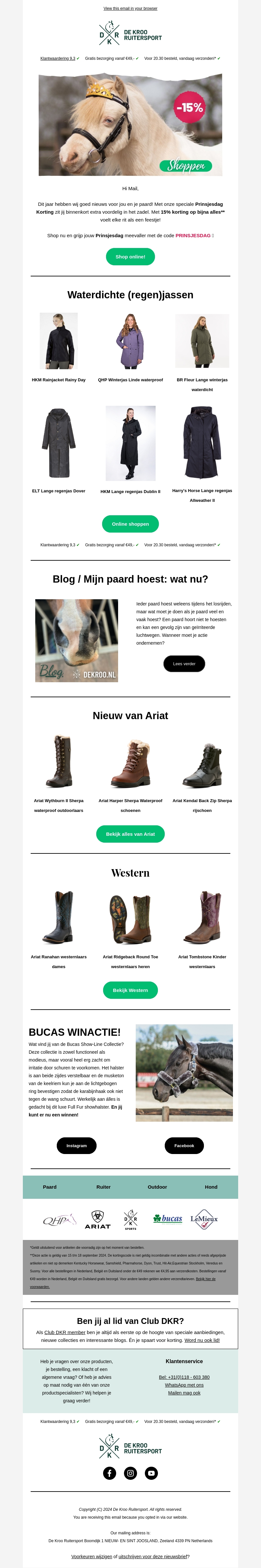 We hebben groot nieuws voor je paard! Geniet van 15% korting op speciale regenkleding. Bekijk onze blog over hoestende paarden en ontdek nieuwe producten van Ariat en Bucas. Mis de kans niet op geweldige prijzen met de Bucas winactie.
