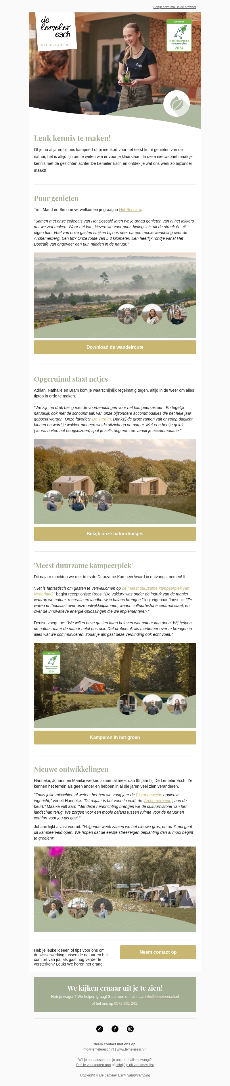 In deze nieuwsbrief maak je kennis met de gezichten achter De Lemeler Esch. Lees over de onderhoudsinspanningen van het team en ontdek waarom De Lemeler Esch de meest duurzame kampeerplek is. Nieuwe ontwikkelingen worden besproken, en we delen enthousiaste verhalen van onze medewerkers. Mis de wandelroute en natuurhuisjes niet!