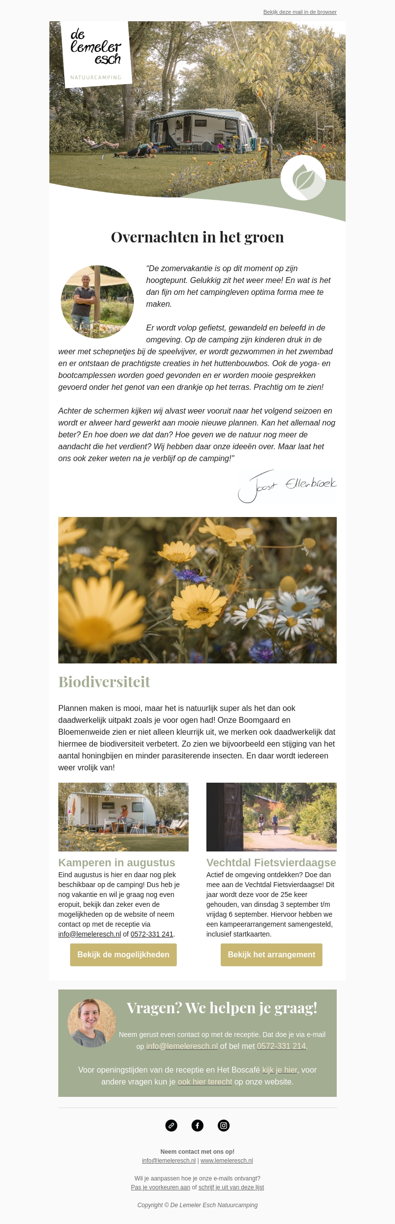 De zomer is in volle gang en het weer zit mee. Wat is er dan fijner dan optimaal te genieten van het campingleven? Bij De Lemeler Esch kun je volop fietsen, wandelen en heerlijk ontspannen midden in de natuur. Ook kinderen kunnen hier hun hart ophalen met diverse activiteiten.