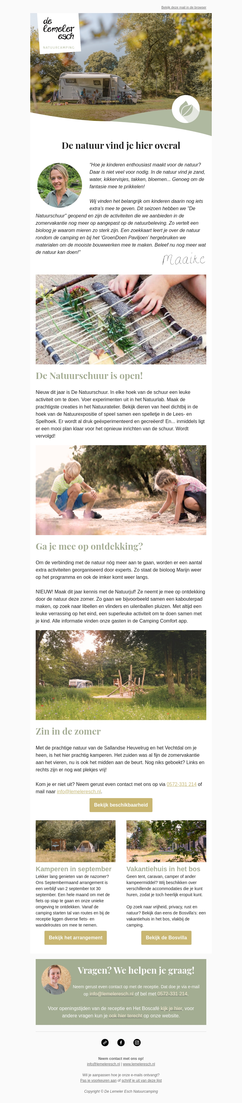 Beleef de zomer bij De Lemeler Esch! Onze natuurcamping biedt tal van activiteiten, zoals kamperen, creatieve workshops in De Natuurschuur en ontdekkingsreizen in de natuur. Boek nu je arrangement en geniet van een onvergetelijke zomer vol avonturen.