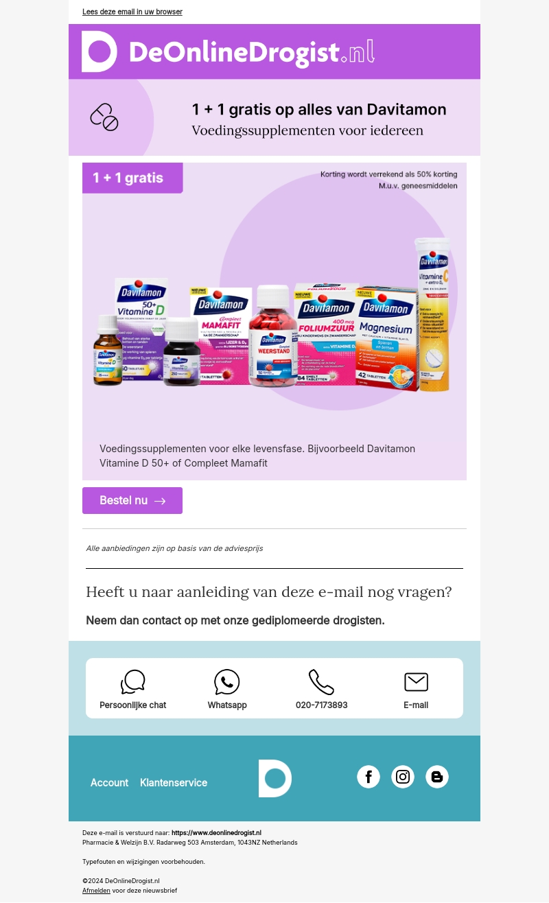 Ontdek de geweldige aanbieding van Davitamon bij DeOnlineDrogist: 1 + 1 gratis op alles! Of je nu op zoek bent naar vitamines voor elke levensfase of specifieke supplementen zoals Vitamine D 50+ of Compleet Mamafit, we hebben het allemaal. Deze deal is perfect om je gezondheid te ondersteunen. Haast je om van deze beperkte tijd aanbieding te profiteren!