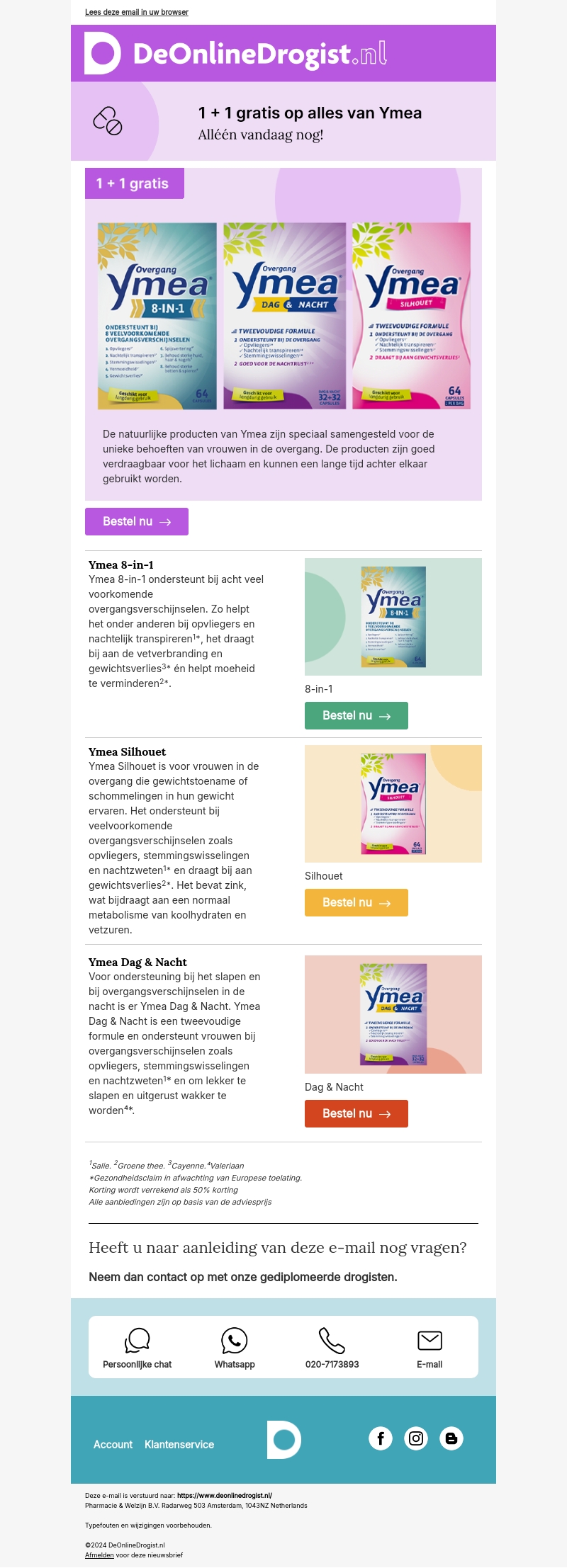 Ontdek de speciale Ymea aanbieding bij DeOnlineDrogist.nl: 1 + 1 gratis op alle producten van Ymea. Perfect voor de ondersteuning bij overgangsverschijnselen. Alleen vandaag geldig, dus wees er snel bij!